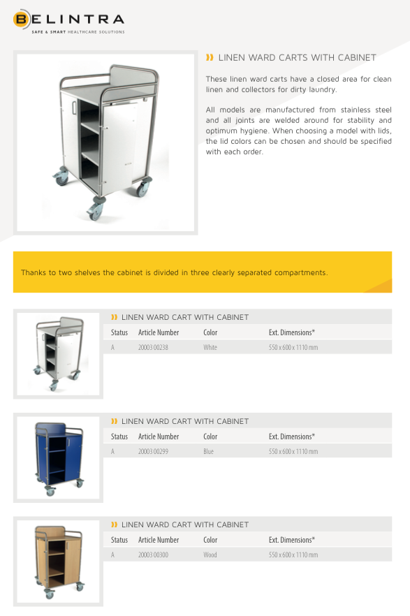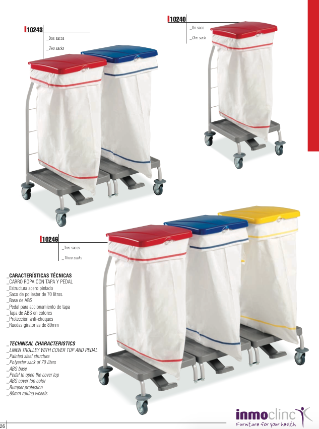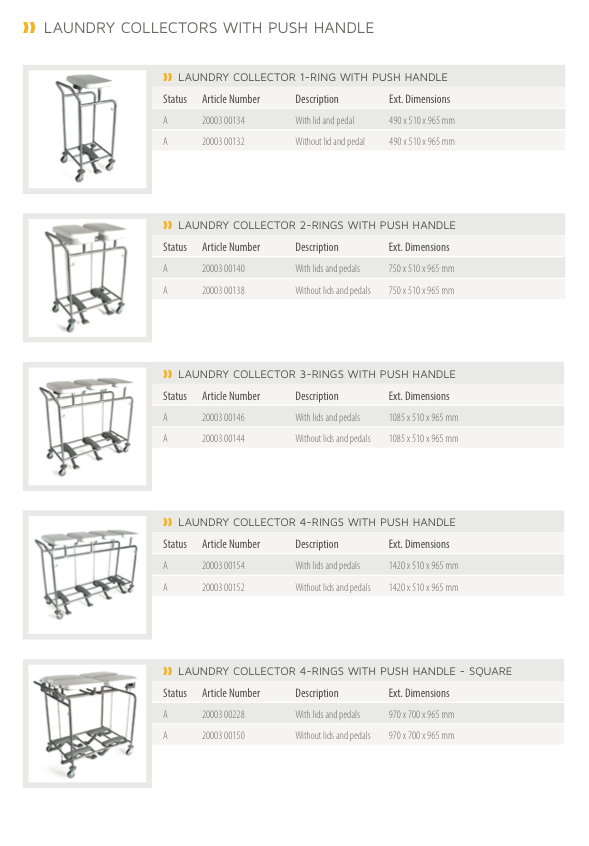 Pesu- ning prügikärude tootevalikus on palju erineva konfiguratsiooniga tooteid. Kliendil on võimalik valida ühe ning mitme kotiga kärude vahel, samuti on võimalik valida kottide asetus kärul. Pakkumisel on lahtised tavapärased pesukärud, kinnised eraldi kapiga pesukärud ning erinevad prügikärud.