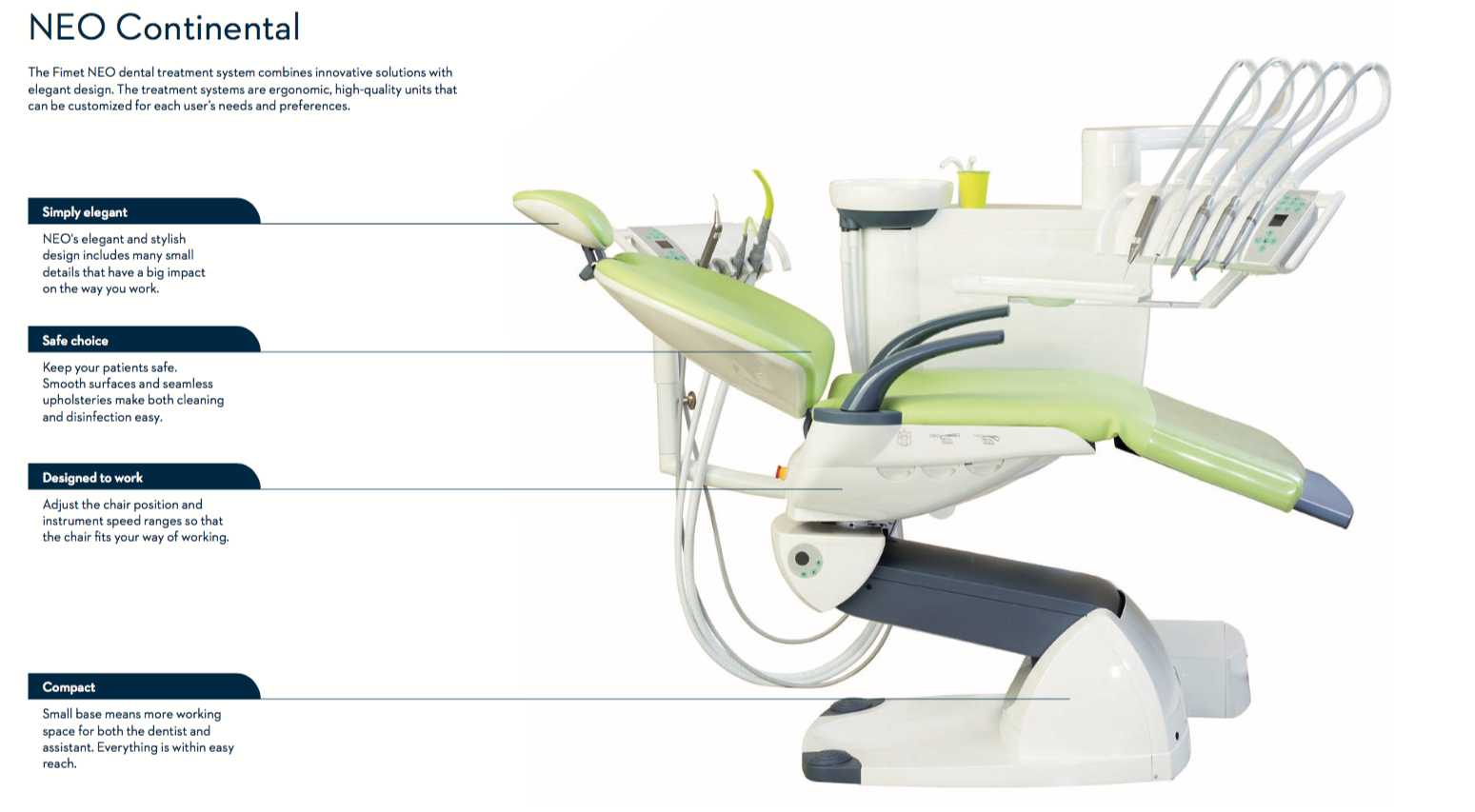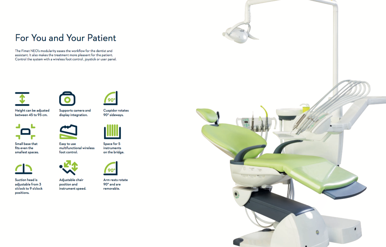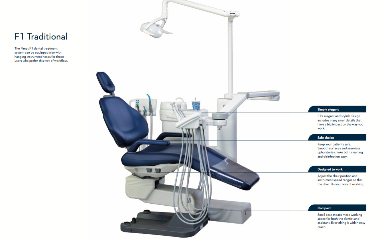 Tootjafirma FIMET on tuntud kvaliteetsete hambaravitoolide tootja Soomes. Tootevalikusse kuuluvad F1 ja NEO seeria ravitoolid, lisaks ka arsti ja assistendi töötoolid. Pakutavad hambaravitoolid on hea funktsionaalusega, kasutajasõbralikud nii patsiendile kui ka arstile ning taskukohase hinnaga.Fimeti seadmeid on Eestis edukalt müüdud ja kasutatud juba pikki aastaid ning meil on hea meel teatada, et alates 2018 aastast on ametlikuks edasimüüjaks Medivar OÜ.